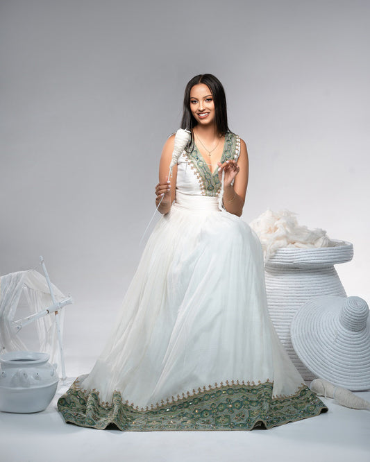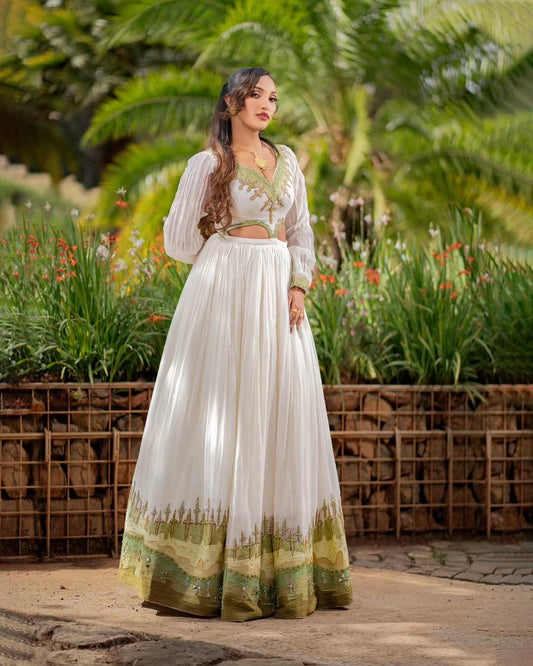 White V-Neck Habesha Dress Green & Gold Tibeb Ethiopian Wear Elegant Cultural Habesha Kemis 0058