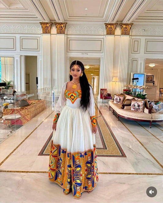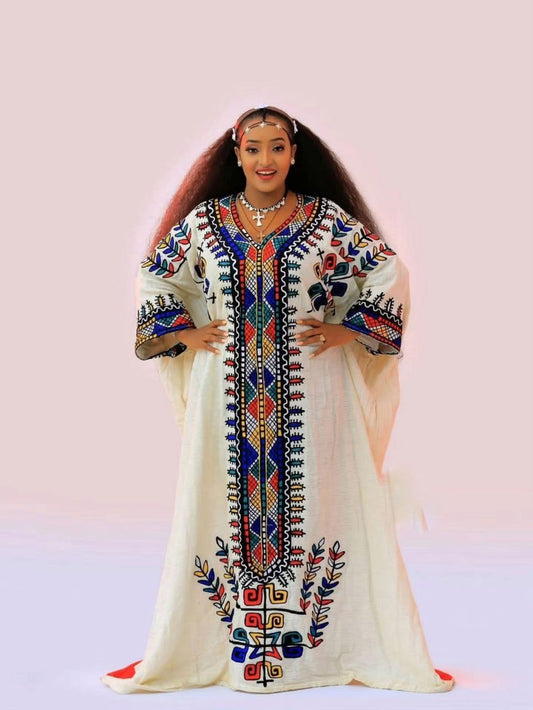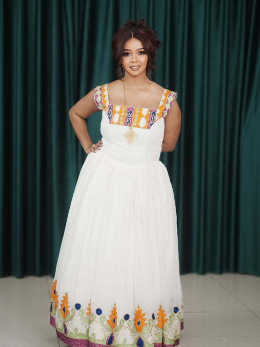 Beautiful Vibrant Shimena Dress with Tilf Embroidery, Habesha dress, Habesha Kemis, Eritrean dress, ሀበሻ