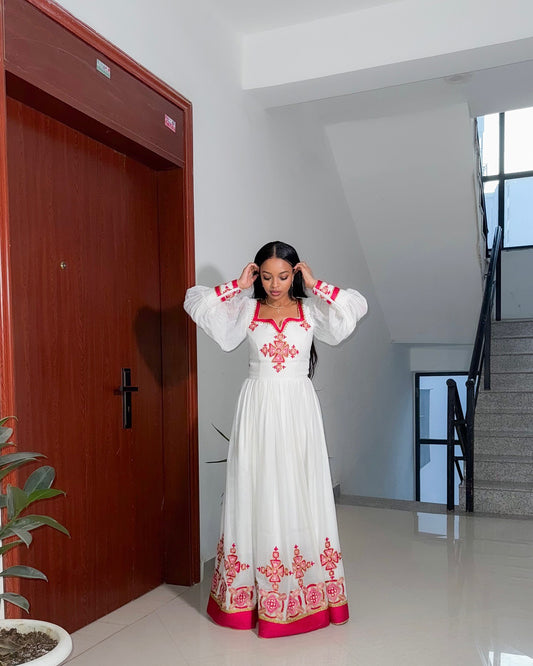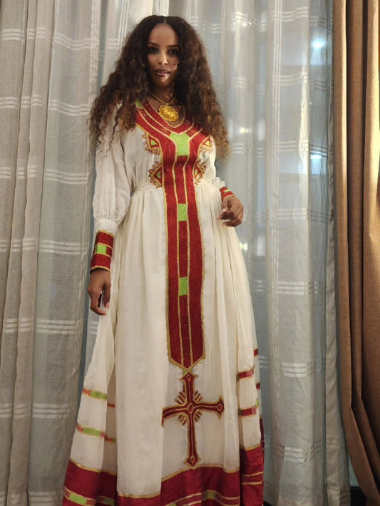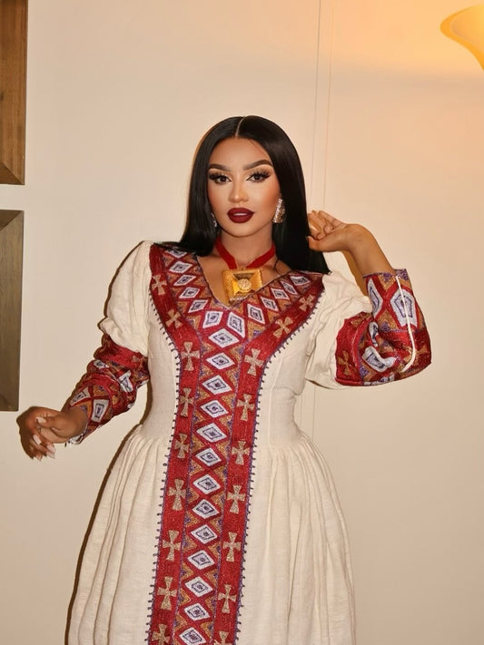 Red Embroidered Habesha Kemis Long Sleeve Ethiopian Traditional Dress Cross Design Habesha Dress 165