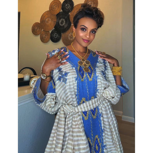 Traditional Habesha Dress Blue and Gold Embroidery Habesha Kemis Stunning Ethiopian & Eritrean Clothing 153