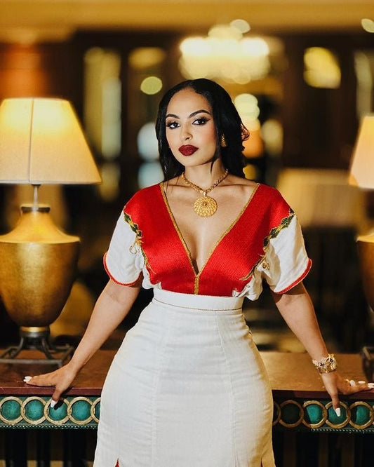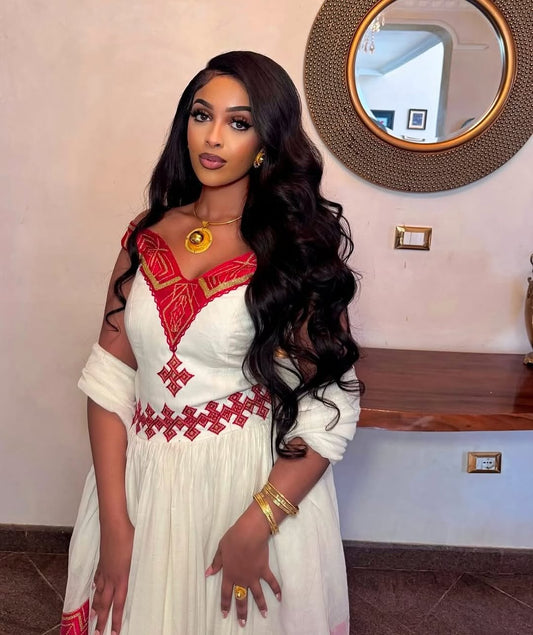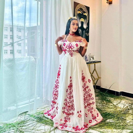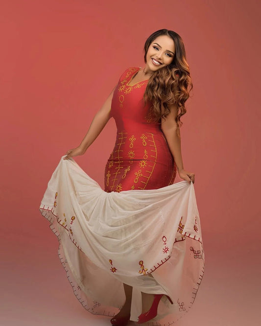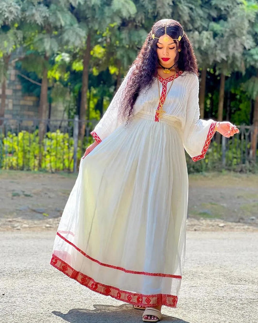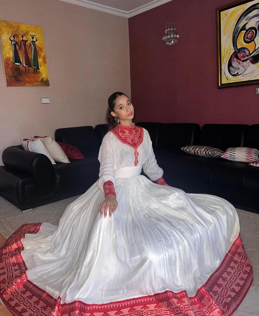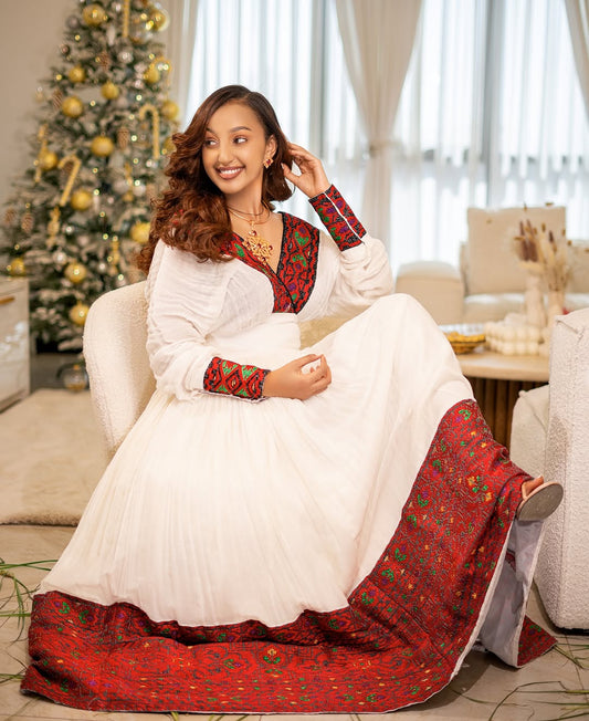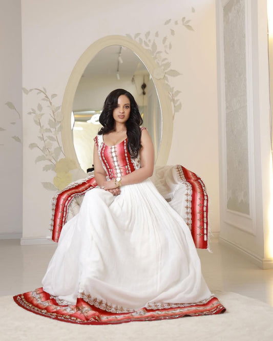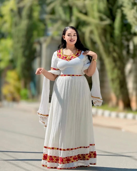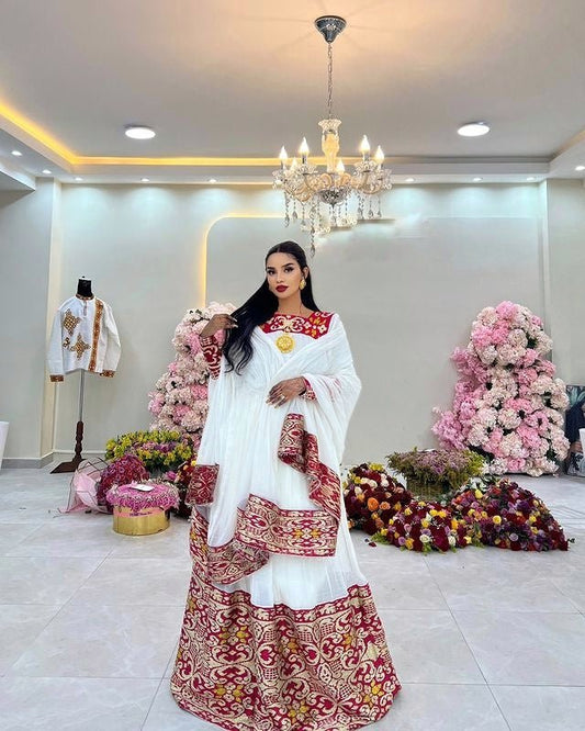 Elegant Ethiopian Habesha Dress with Red & Gold Embroidery for Celebrations