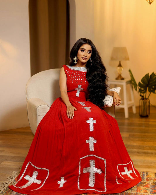 Shiny Red Modern Habesha Dress Design Silver Cross Beaded Ethiopian Traditional Dress