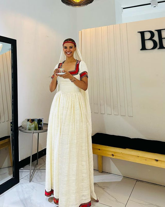 Cream Colored Traditional Ethiopian Dress: with Scarlet Red Handcrafted Habesha Dress Relaxed Eritrean Clothing