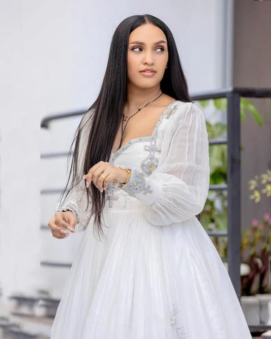 Handwoven Modern Ethiopian Wedding Dress: Majestic Silver Embellishments Habesha Wedding Dress