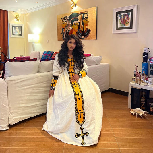 Elegant Habesha Kemis with Black & Gold Cross Embroidery – Ethiopian Traditional Dress