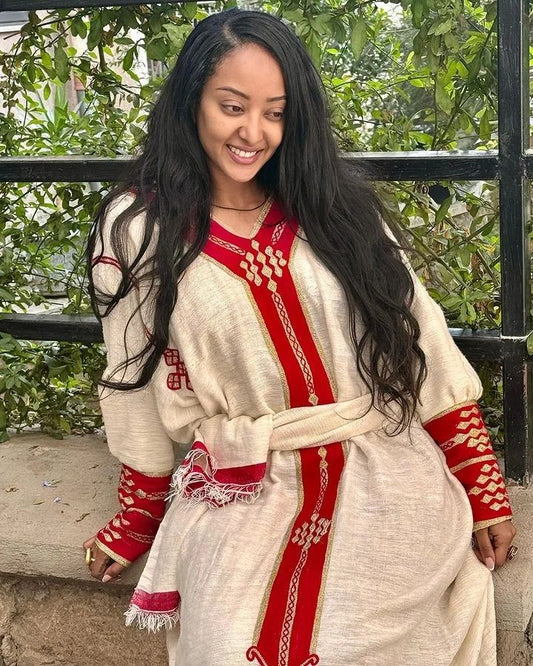 Blazing Hot Red Habesha Wedding Dress: Intricate Wide Embroidery on Traditional Ethiopian Wedding Attire