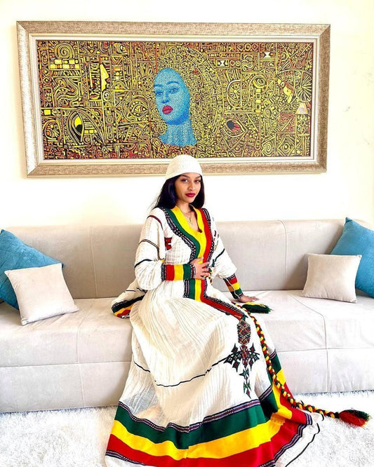 Majestic Fetil Flag Habesha Kemis with Shimena and Tilf, Habesha dress, Eritrean dress, Zuria, ሀበሻ