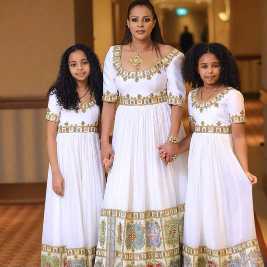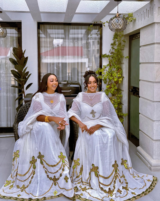 Sparkling Golden Modern Habesha Dress: with Cross-Stitch Intricate Embroidery Traditional Ethiopian Dress