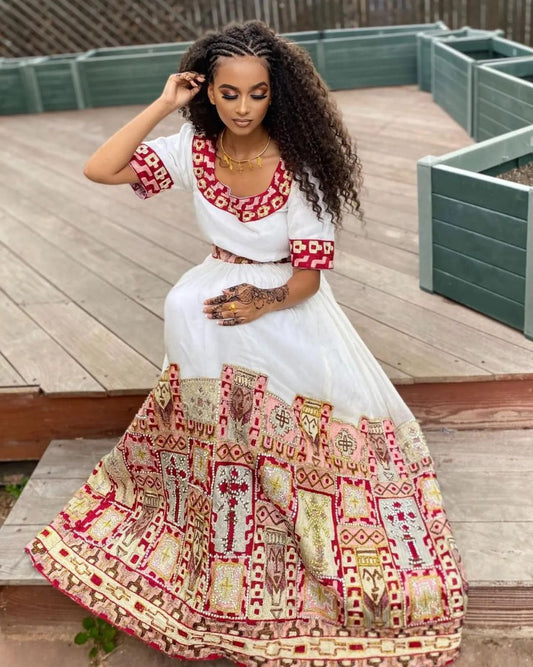 Fashionable Multicolored Ethiopian Dress: Cross Embellishments with Bright Colors Traditional Eritrean Cloth Beautiful Habesha Dress