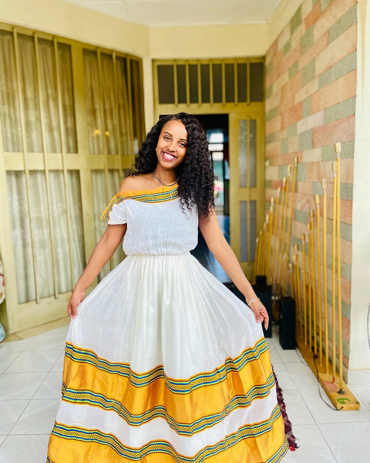 Sparkling Off Shouldered Yellow Ethiopian Dress: with Colorful Handmade Embroidery Habesha Dress Elegant Matching Eritrean Clothing