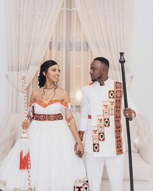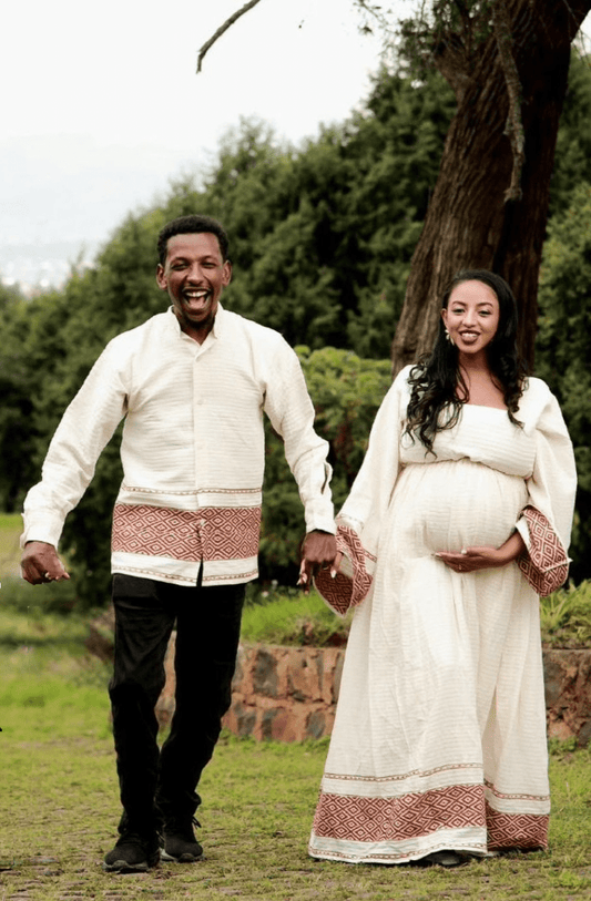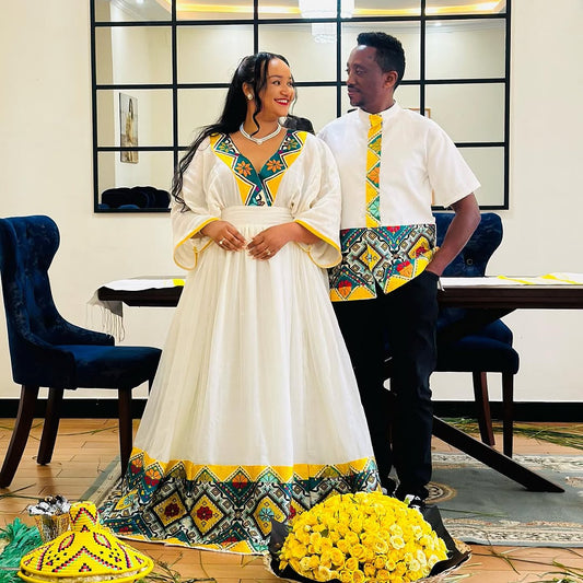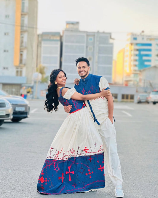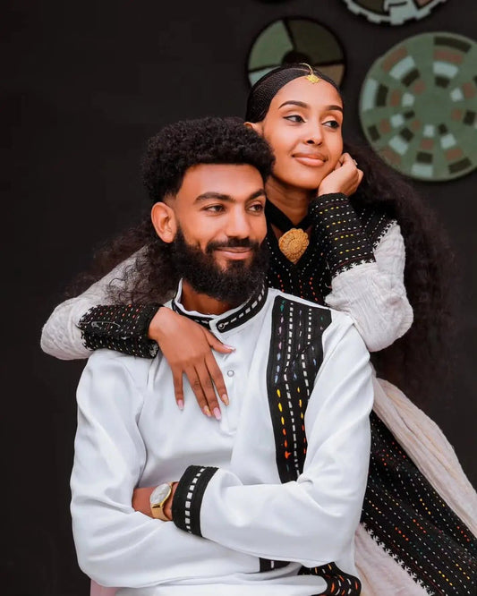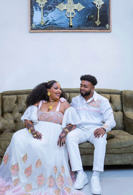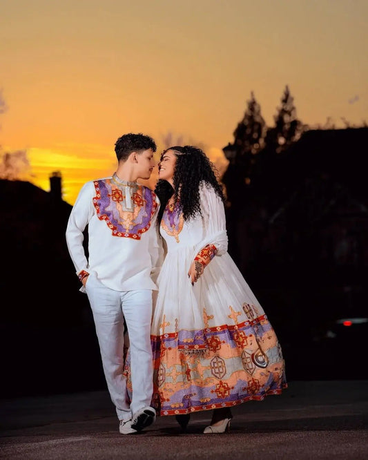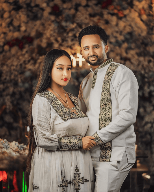 Discover coordinated Ethiopian couple’s outfits made for love and tradition. From weddings to holidays, our Habesha wedding wear captures the spirit of togetherness.