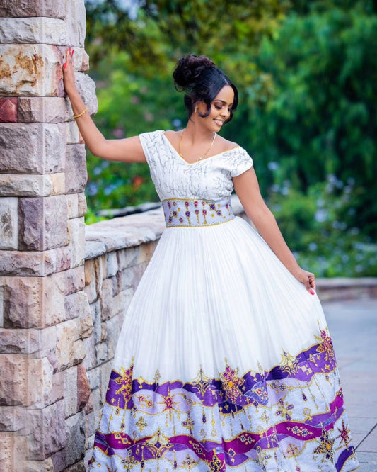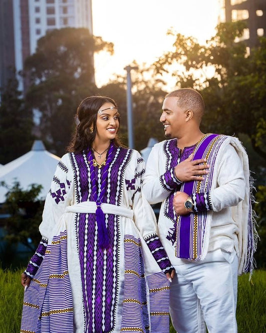 Elegant Purple Cultural Ethiopian Couples Outfit Habesha Couple's Outfit Purple Cultural Habesha Dress