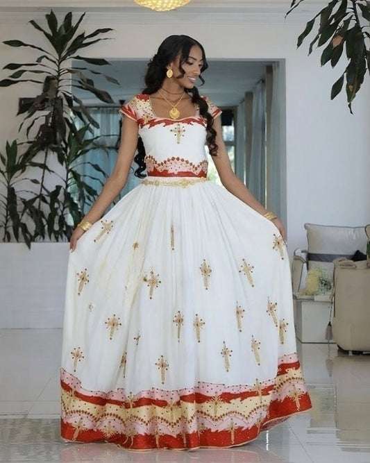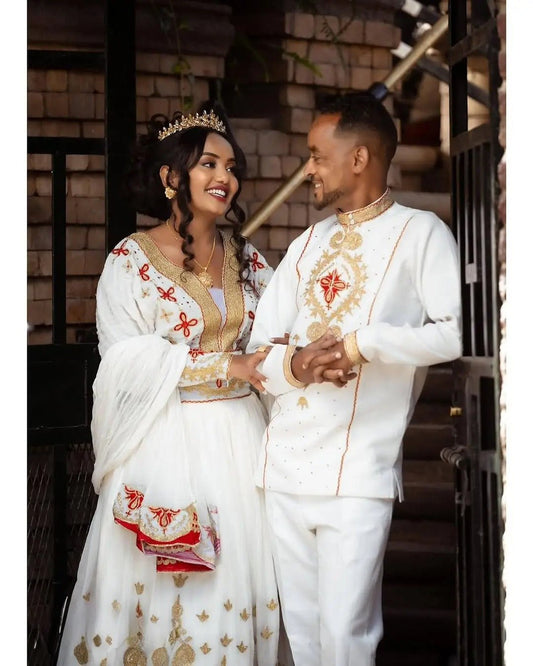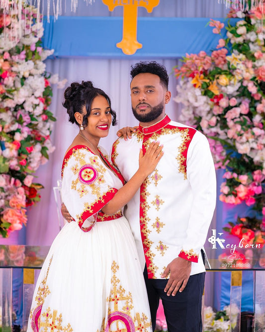 Dazzling Red Habesha Couples Outfit: Handcrafted Elegance with Matching Ethiopian Wedding Attire