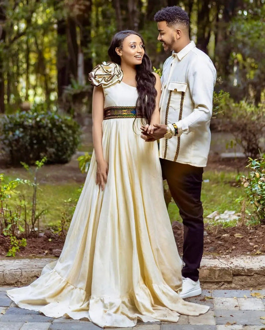Shimmering Golden Ethiopian Traditional Couples Outfit: Elegant Look with Your Beloved in Matching Habesha Attire