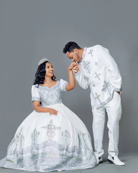 Sparkling Silver Ethiopian Couples Wedding Attire: with Golden Beaded Detailing Matching Habesha Couples Outfit