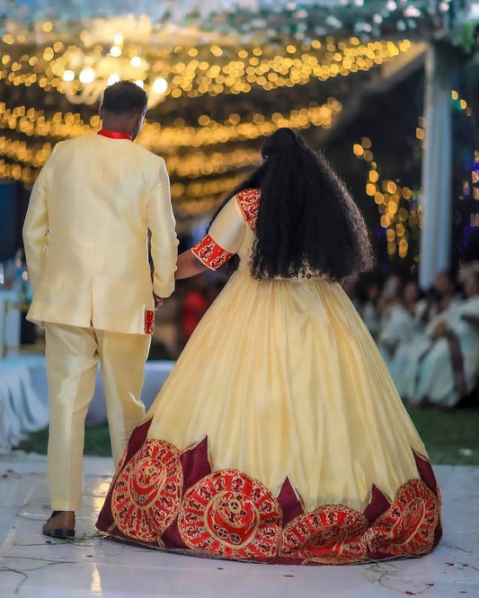 Vibrant Yellow Ethiopian Wedding Outfit: Newly Designed Matching Habesha Couples Outfit