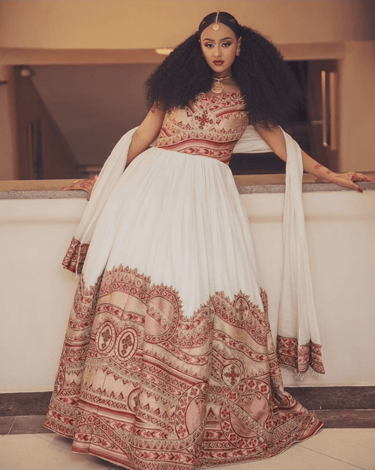 Timeless Elegance in Cream and Red Matching Habesha Attire: Modern Traditional Ethiopian Outfit for Couples