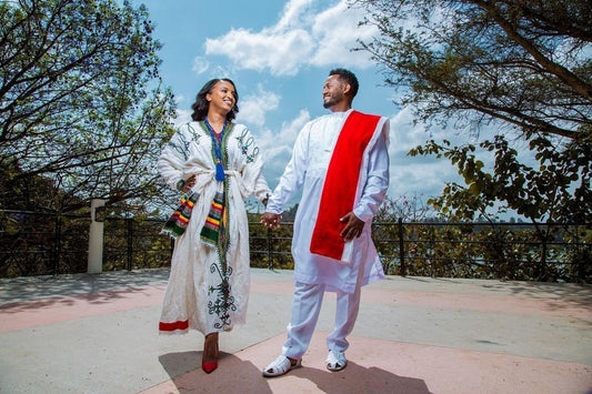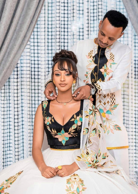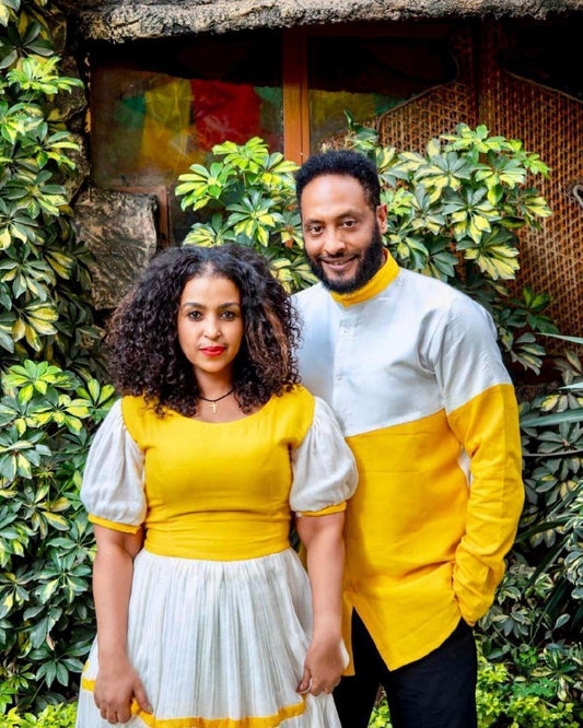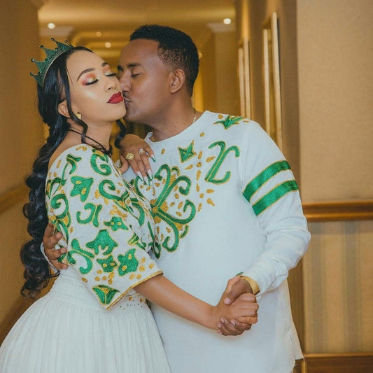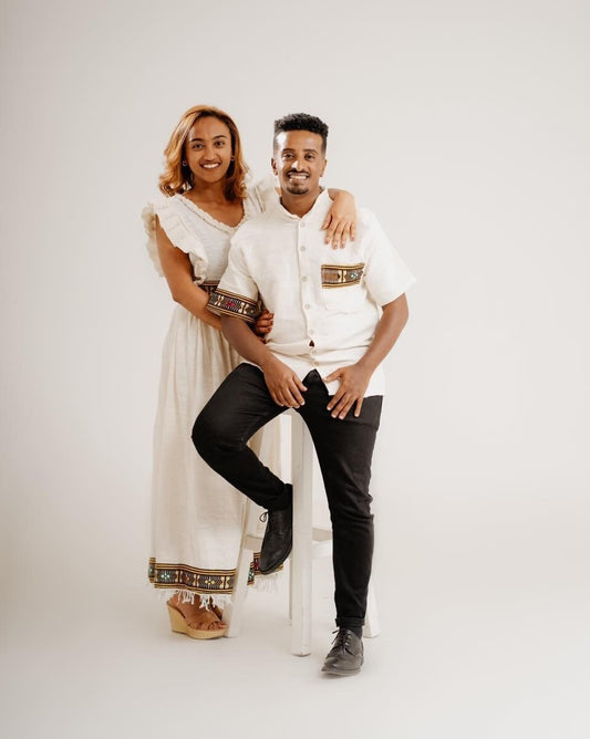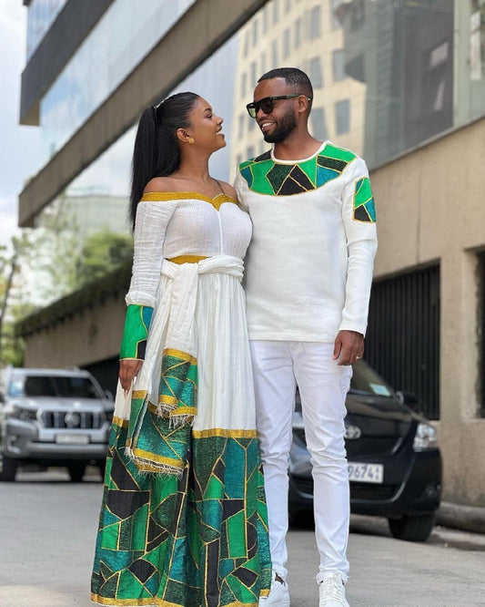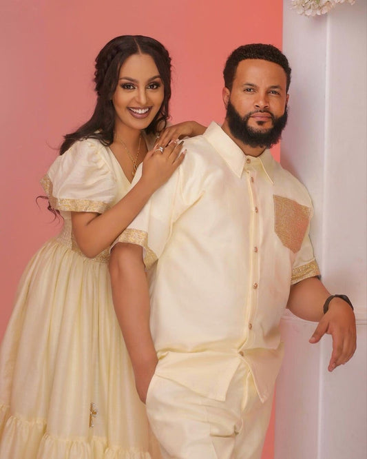 Discover coordinated Ethiopian couple’s outfits made for love and tradition. From weddings to holidays, our Habesha wedding wear captures the spirit of togetherness.