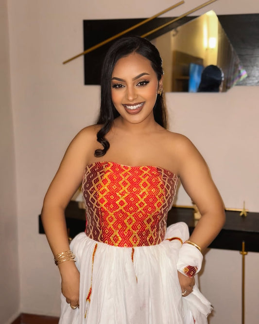 Modern Ethiopian Habesha Dress Red And Gold Bodice Embroidery Habesha Kemis Strapless Ethiopian Dress With Cultural Depth 0079