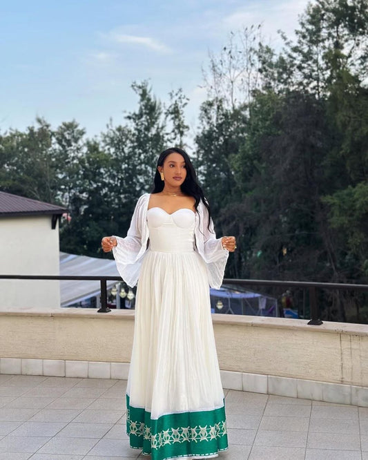 Radiant Habesha Dress with Elegant Green Embroidery a Beautiful Choice for an event