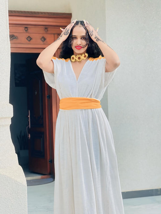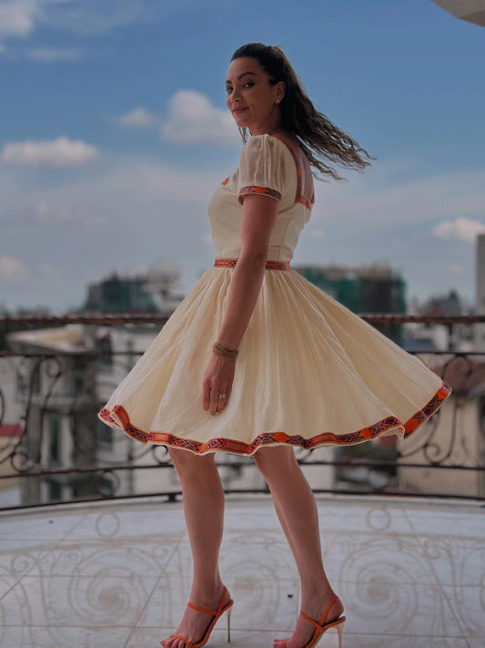 Traditional Ethiopian Dress Cream with Orange Handwoven Habesha Kemis Short Sleeve Cultural Habesha Dress 0093