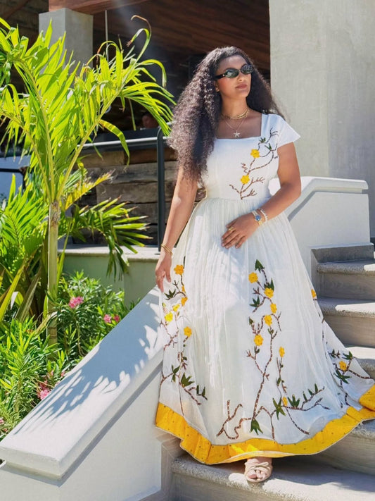 Yellow Floral Habesha Kemis Graceful Ethiopian Traditional Dress Nature-Inspired Embroidery Habesha Dress 0099