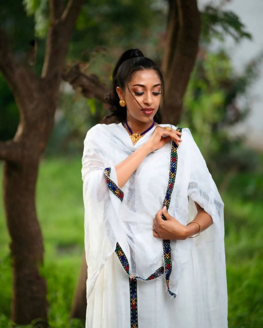 Classic White Habesha Dress Minimalist Multicolor Cross Design Ethiopian Clothing Traditional Elegance Habesha Kemis 144