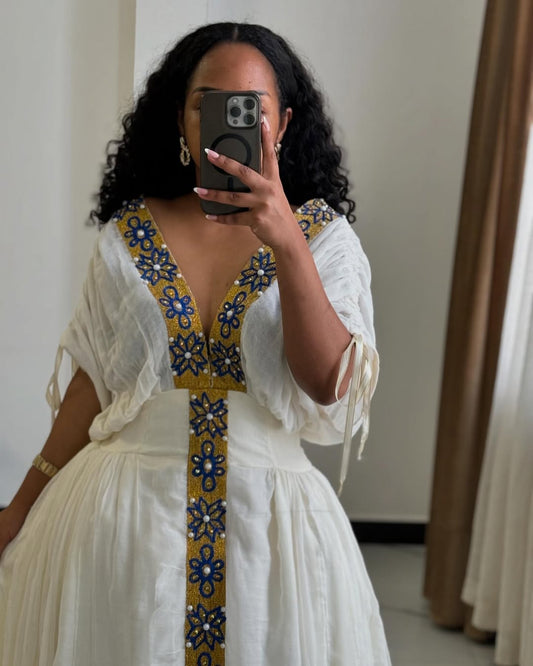 Elegant Habesha Kemis with Blue and Gold Embroidery – Habesha Dress – Ethiopian Traditional Clothing