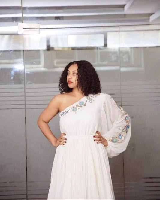 Chic One Shouldered Habesha Dress: with Blue and Golden Traditional Embroidery Ethiopian Dress
