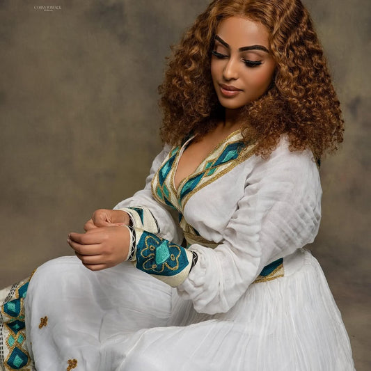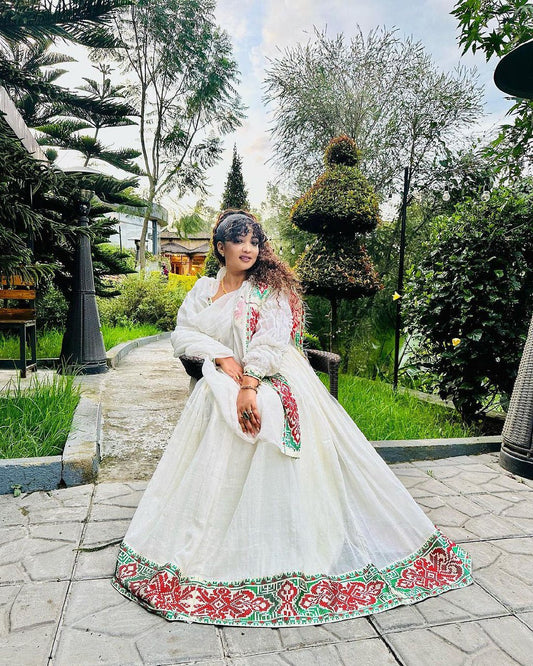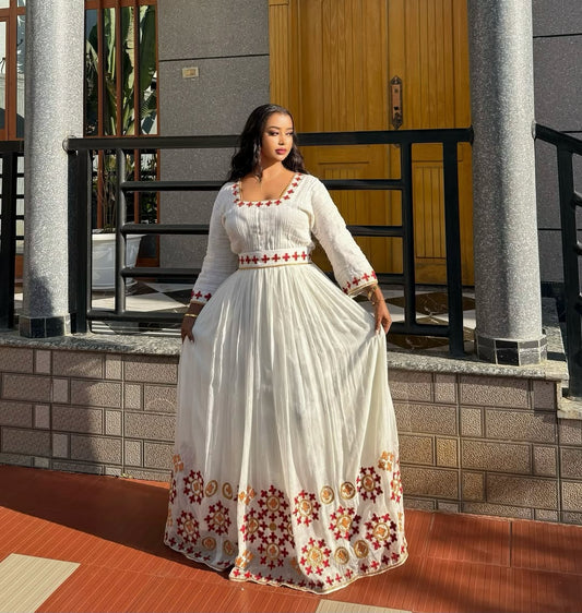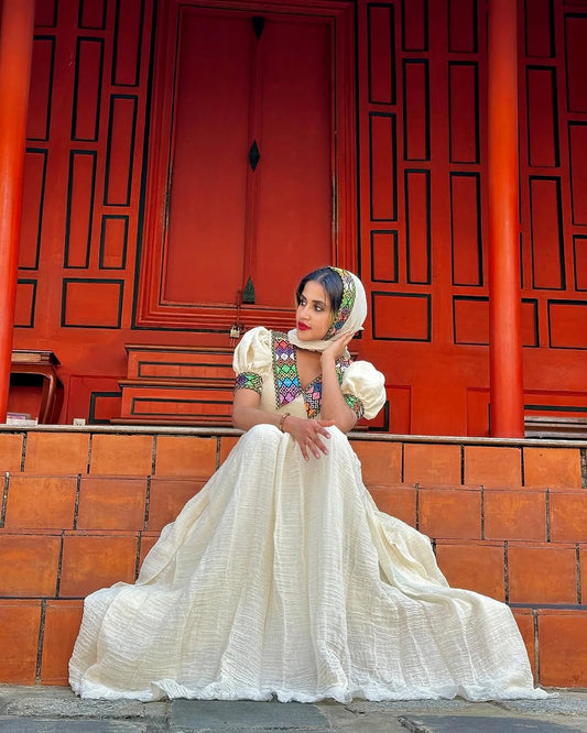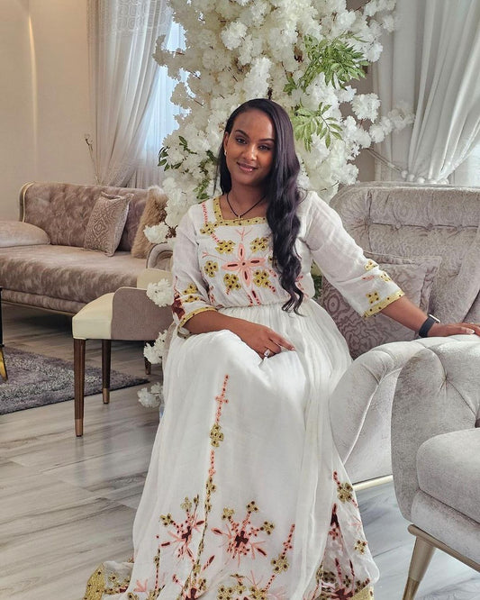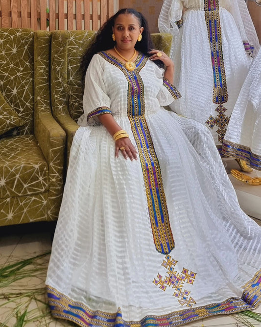 Elegant Traditional Ethiopian Dress: Multicolored Embroidered Habesha Dress for Cultural Celebrations