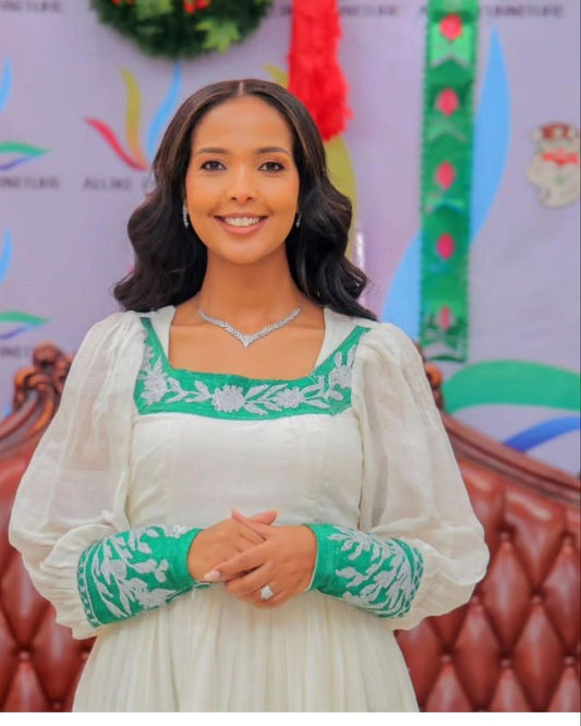 Green Based Multicolored Habesha Dress: Intricate Handmade Traditional Ethiopian Dress for Special Events Habesha Kemis