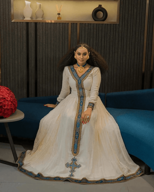 Graceful Off-White Ethiopian Dress: with Blue Cross-Stitched Detailing Habesha Dress