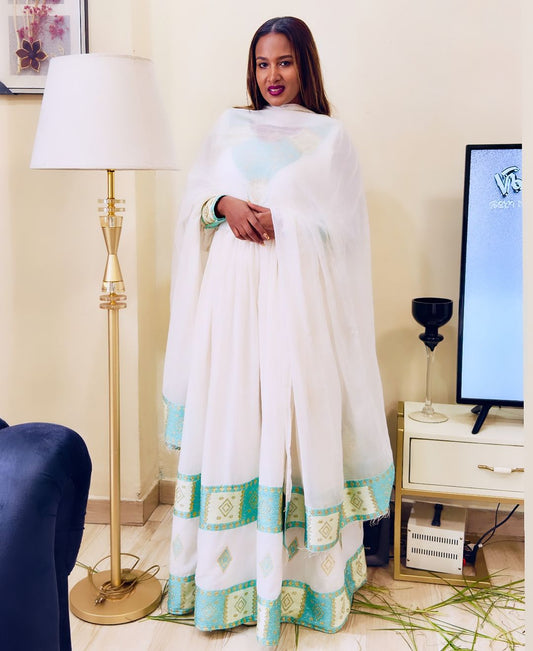 Enchanting Light Blue Habesha Dress: with Red Diamond Detailing Traditional Ethiopian Dress