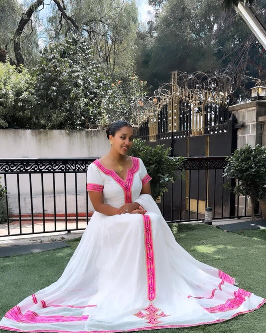 Radiant Look with Pink and Purple Habesha Dress: Asymmetrical Modern Neckline Traditional Dress for Holidays and Religious Events Ethiopian Clothing