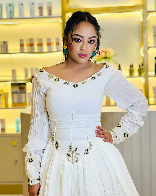 Divine White Ethiopian Traditional Dress: with High Neck Collar and Puffy Sleeves Habesha Dress Modern Habesha Kemis