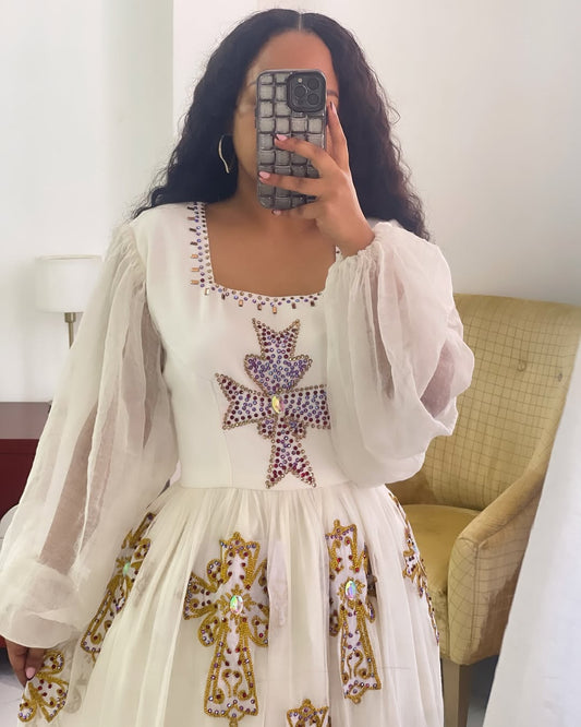 Elegant Cross Beaded Traditional Ethiopian Dress: Golden Detailing Habesha Dress Versatile Modern Look Habesha Kemis