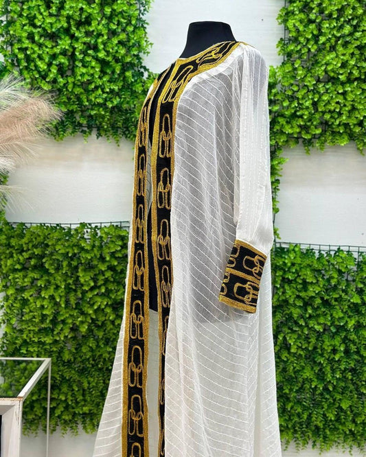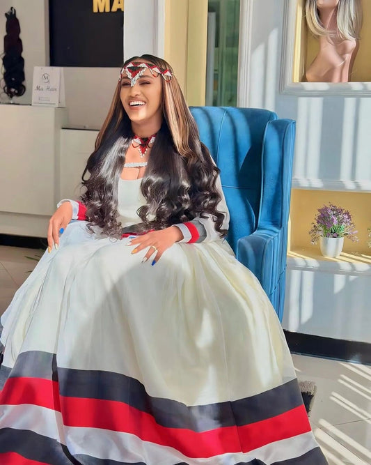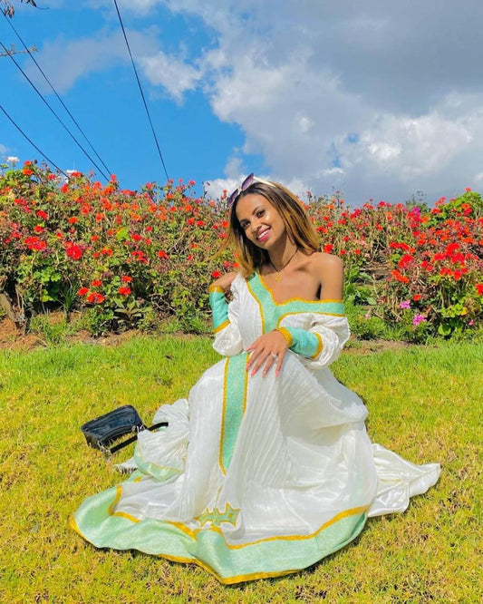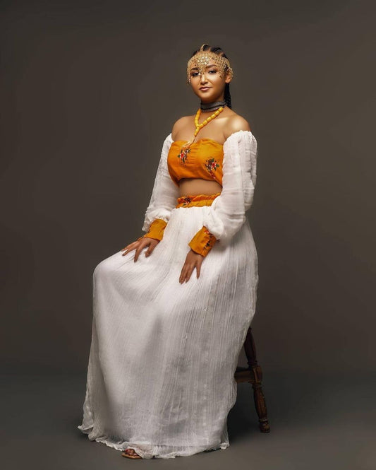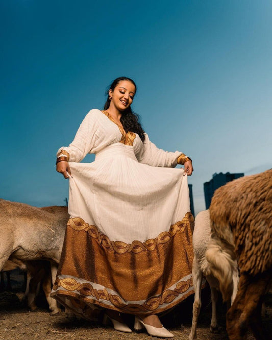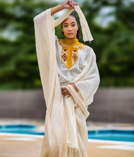 Traditional Ethiopian Outfit with Golden Tilet Neck Free Size Ethiopian Dress