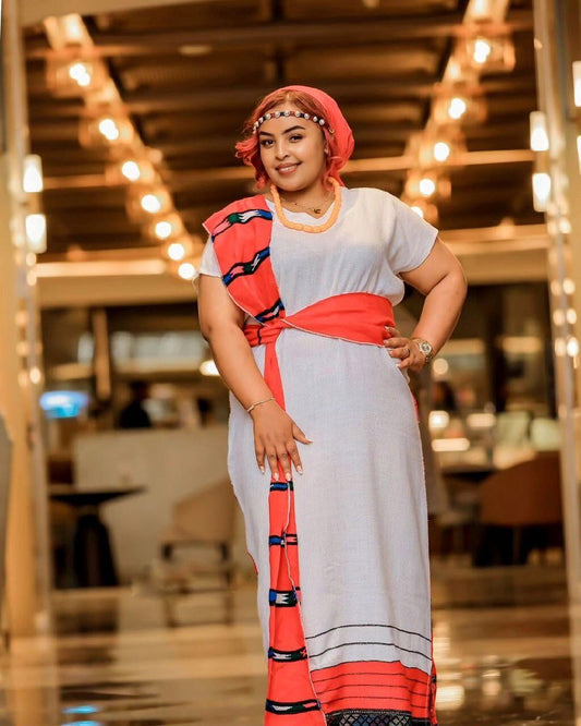 Red Oromo Cultural Dress Traditional Kemise Dress with Bold Design