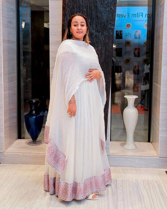 Graceful Blush Bloom: Modern Menen Fabric in Habesha Kemis