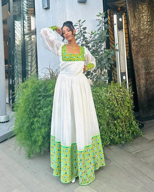 Vibrant Green Ethiopian Traditional Dress Cultural Habesha Kemis