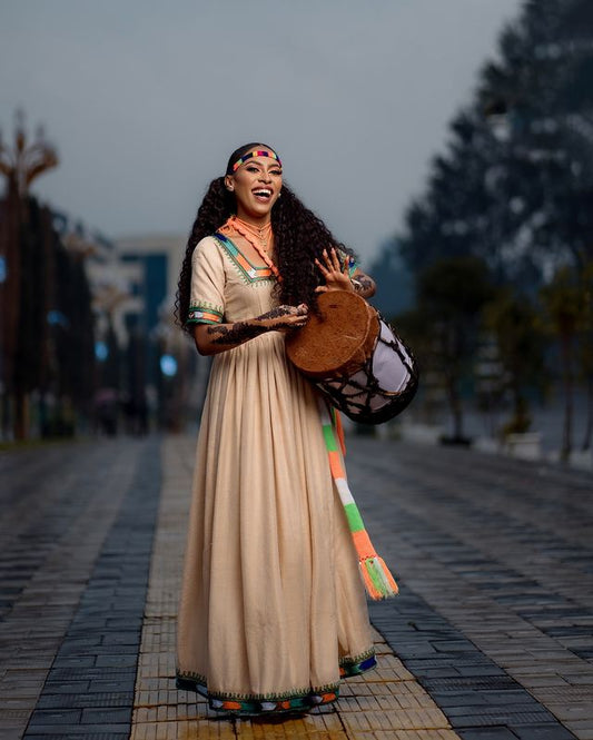 Elegant Cream Ethiopian Traditional Dress Cultural Habesha Dress for Ashenda