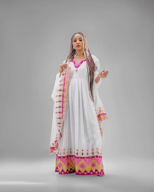 Adorning the Habesha Kemis with Pink Diamond-like Designs Habesha Dress Modern Ethiopian Dress Style
