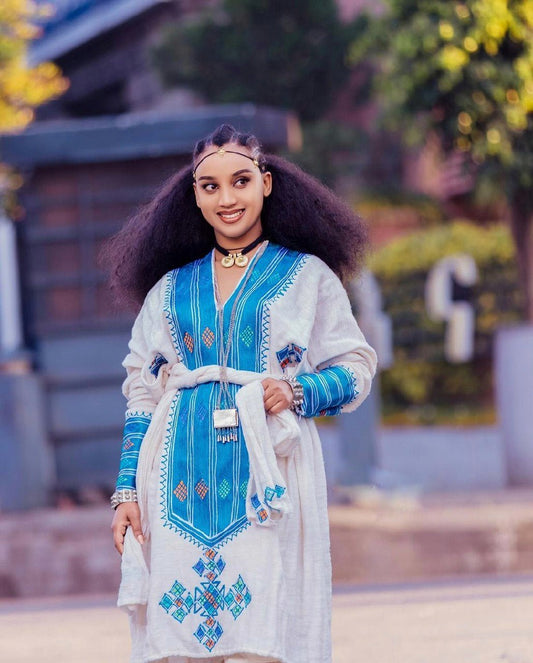 Blue Majesty Habesha Kemis Stunning Menen Fabric Habesha Dress