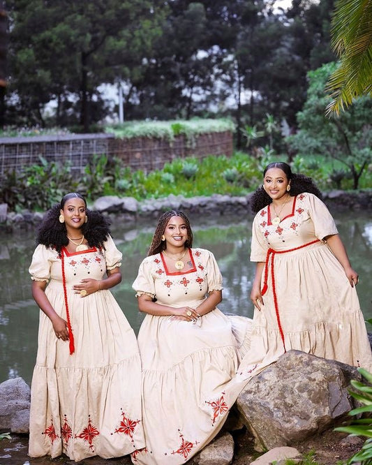 Cream with Red Design Habesha Kemis Classic Ethiopian Traditional Dress