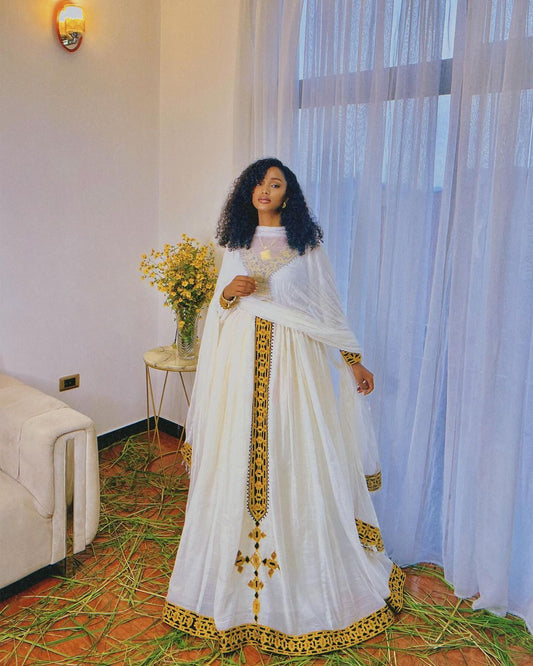 Elegant Cream Ethiopian Traditional Dress Cultural Habesha Dress for Ashenda
