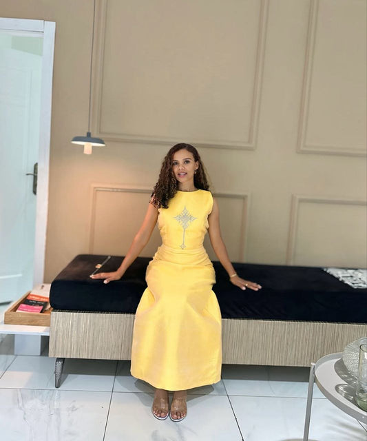 Elegant Yellow Simple Habesha Dress with Subtle Traditional Cross Design For an Event