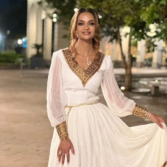 Elegant White Traditional Ethiopian Dress: with Narrow Embroidery Simple Habesha Dress for Heavenly Look Eritrean Clothing