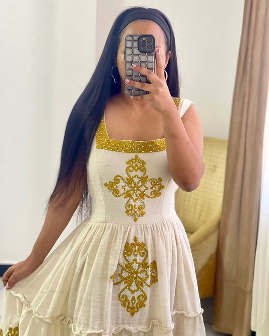 Graceful Golden Traditional Ethiopian Dress: with Contemporary Patterns Habesha Dress for Your Next Event Habesha Kemis