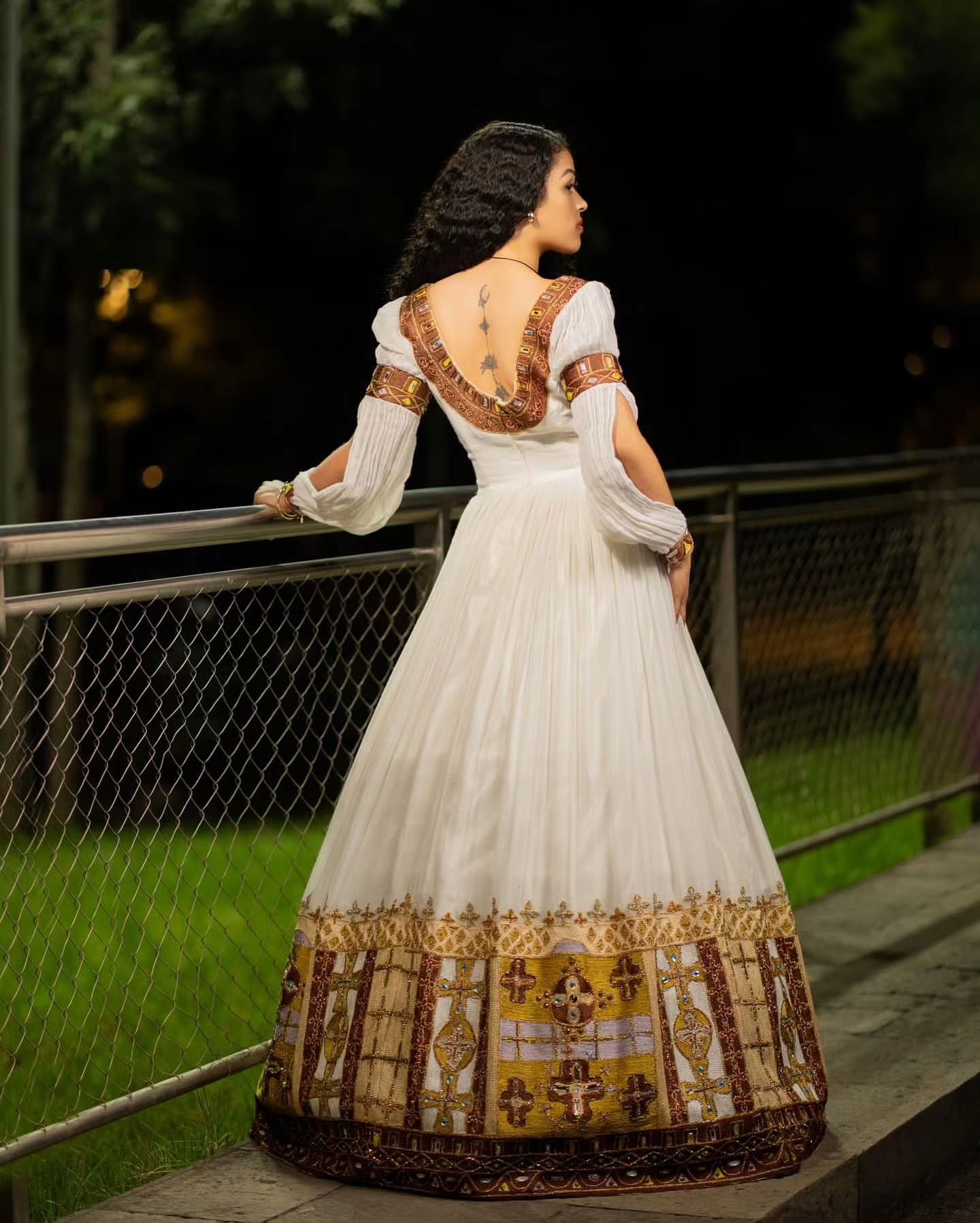 This regal Traditional Ethiopian dress is a breathtaking representation of cultural elegance and spirituality. Adorned with intricate cross patterns and traditional Habesha cloth embroidery in shimmering gold and deep brown, it symbolizes both heritage and holiness. The flowing white fabric, paired with detailed borders and matching sleeves, makes this an exquisite choice for an Ethiopian wedding dress or formal cultural celebration. The beauty and symbolism embedded in this design capture the timeless essence of Ethiopian clothing.