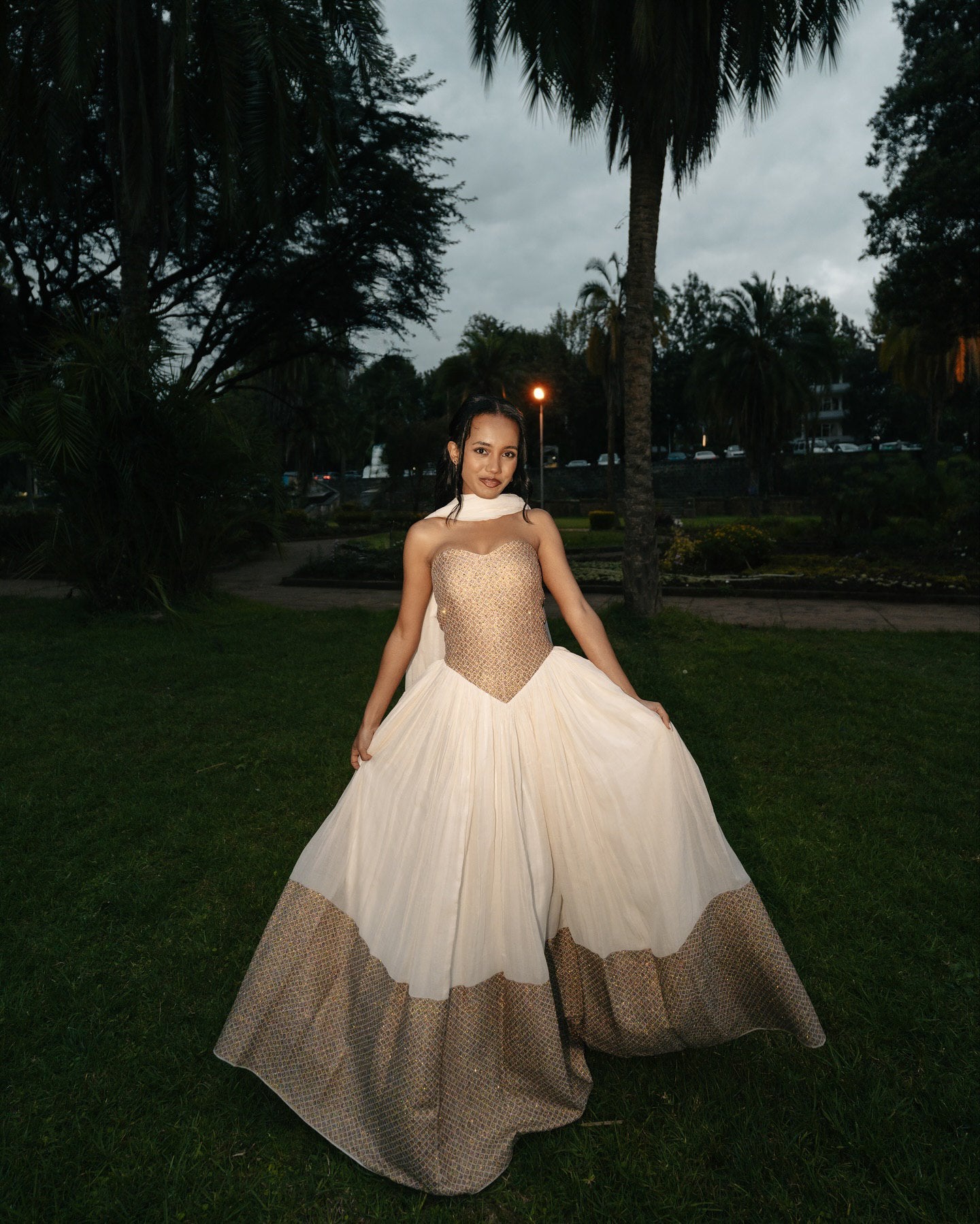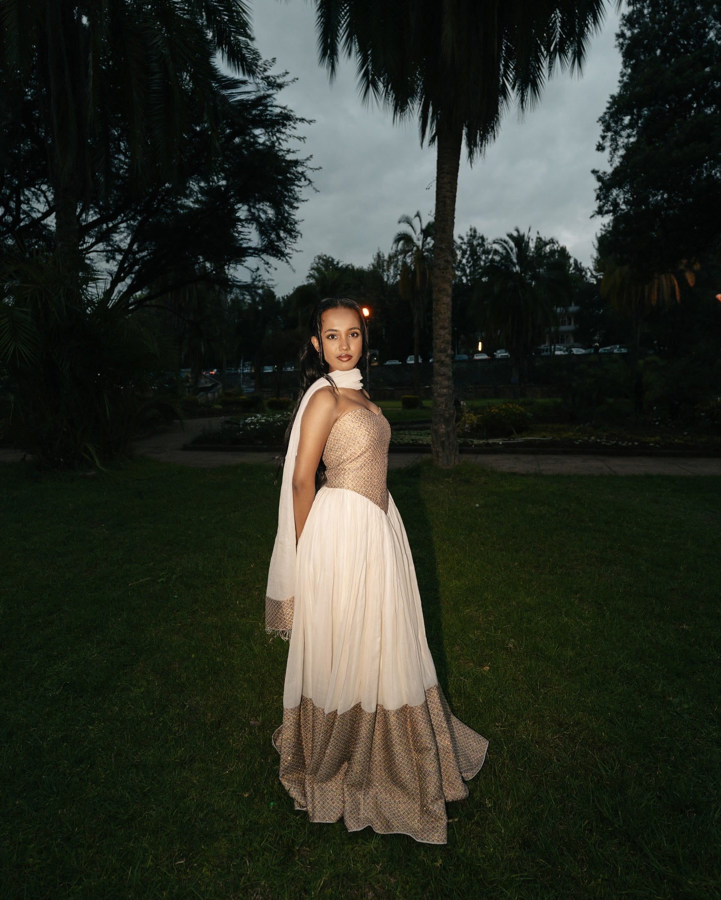 This stunning Ethiopian couple radiates grace and sophistication in their beautifully coordinated traditional attire. The woman’s gown features a strapless gold and white dress, perfectly draped with soft flowing fabric that adds a touch of regal elegance. Her confident presence complements the rich cultural tones of Ethiopian fashion while maintaining a modern flair.